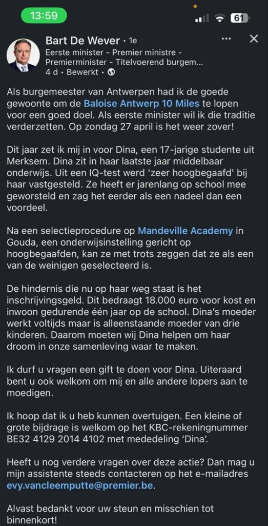 De Belgische minister-president Bart DeWever endorsed Dina, een uitzonderlijk hoogbegaafde ‘beautiful mind’, om naar Mandeville te komen (zie onderstaand bericht). De Belgische premier geeft hiermee blijk van moed en visie als het gaat om hoogbegaafdheid. All hail, mp Bart DeWever!