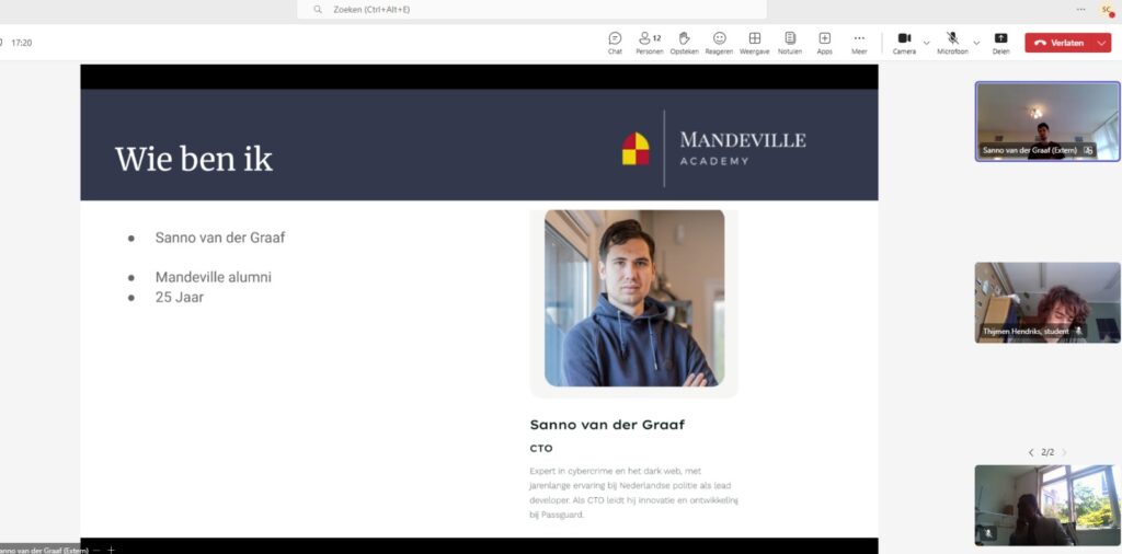 Tijd voor een glimlach en een succesverhaal. Vandaag doceert Sanno van der Graaf bij Mandeville. Sanno is alumnus van Mandeville Academy. Sanno is een klassiek voorbeeld van een UHB’er. Wij ontmoeten Sanno toen hij was uitgevallen op het MBO. Inmiddels is Sanno uitgegroeid tot een van de allerbeste ‘white hat’ hackers in de wereld. Dat weten wij omdat Sanno werkzaam was bij de ……….ssssttt! Inmiddels heeft Sanno zijn eigen, succesvolle bedrijf Passguard opgezet. Dit gaat heel goed. Zo goed zelfs dat de onderneming internationaal gaat.